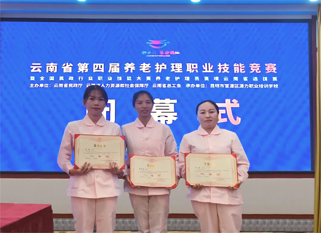 各参赛选手在激烈的角逐中展示了高超的专业技能,为推动养老服务质量提升贡献了力量。在本次比赛中,我司旗下养老机构金麟鸿康养老服务中心的张权会以出色的综合养老护理技能脱颖而出,荣获二等奖。曲靖市老年公寓罗翔获得三等奖、何琴荣获优胜奖。